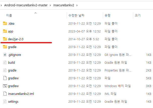 IncsecureBankv2-master에 있는 InsecureBankv2.apk 파일을 dex2jar 폴더로 이동시킨다.